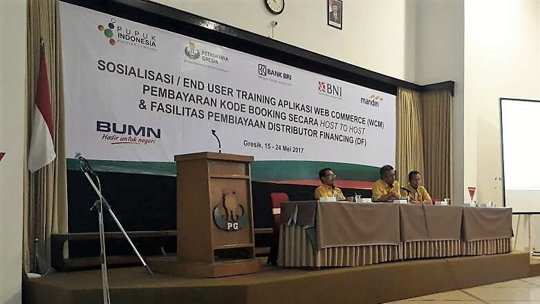 Beberapa distributor pupuk PT Petrokimia Gresik (PG) mengikuti sosialisasi atau end user training selama dua hari di Auditorium Pengembangan SDM PG tanggal 15 dan 16 Mei 2017. Materi sosialisasi yang diterima adalah Aplikasi Web Commerce (WCM) Pembayaran Kode Booking secara Host to Host dan fasilitas pembiayaan Distributor Financing (DF).