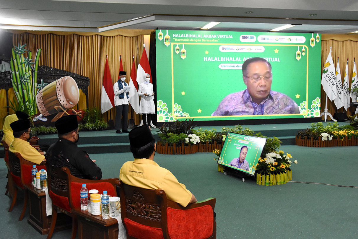 President Commissioner of Petrokimia Gresik, T. Nugroho Purwanto was conveying a speech in the event of Virtual Great Halal Bihalal (Indonesian tradition to gather and ask forgive to each other for celebrates Eid Al-Fitr) of Petrokimia Gresik (19/05/2021). Photo : PG Corcom