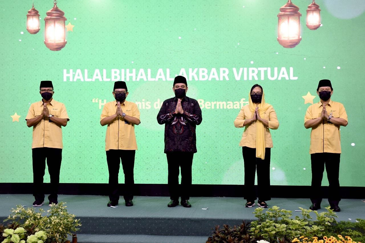 Directors (No. 2,4,5 from left) and Operation SEVP of Petrokimia Gresik (at left) and Ust. H. Ahmad Muzakky, M.H.I., Al-Hafidz (center) were expressing a gratitude of Eid Al-fitr and forgive each other to all employee of Petrokimia Gresik virtually when in Halal Bihalal (19/05/2021). Photo : PG Corcom