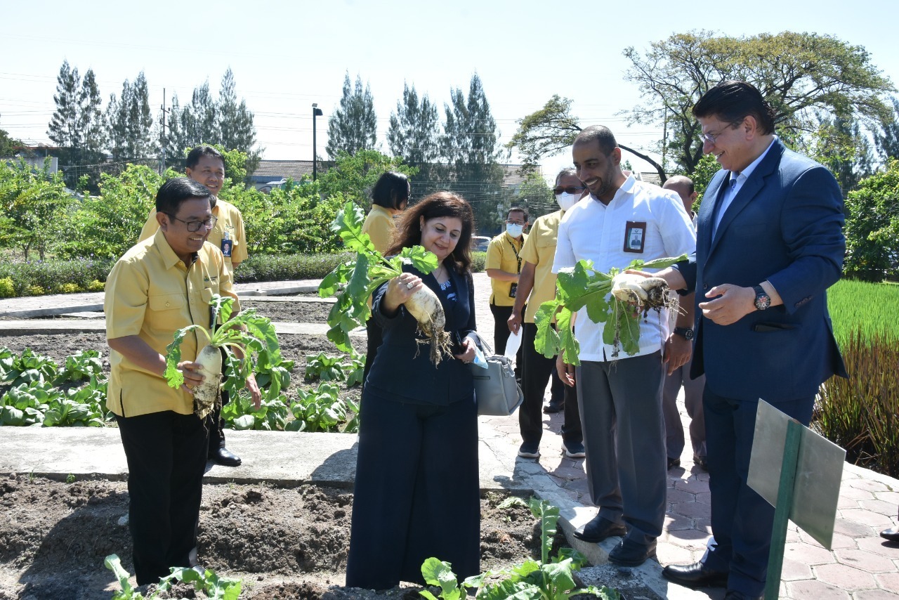 (kiri-kanan) CEO of Jordan Phospate Mines Company (JPMC) Abdel Wahab Al-Rowwad, Director of Tech and Production Petro Jordan Abadi, Anwar Mustafa, Director of Finance JPMC, Sana'a Qara'in, dan Direktur Utama Petrokimia Gresik, Dwi Satriyo Annurogo pada saat memetik sayuran di Kebun Percobaan Petrokimia Gresik (19/7) Foto : Komunikasi Korporat PG